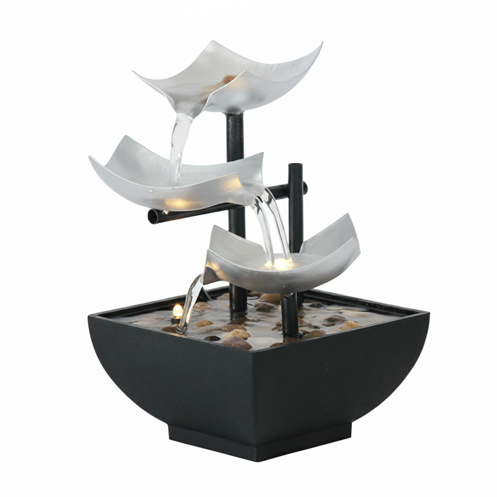Bring tranquility and modern style to any space with this 3-Tier Cascading Tabletop Water Fountain. Featuring three silver-colored, leaf-like bowls, the water flows gently into a dark, river-stone-filled basin, creating a peaceful, calming sound. Integrated LED accent lights illuminate the water flow for a soothing effect, day or night. Perfect for your desk, living room, or bedroom.
